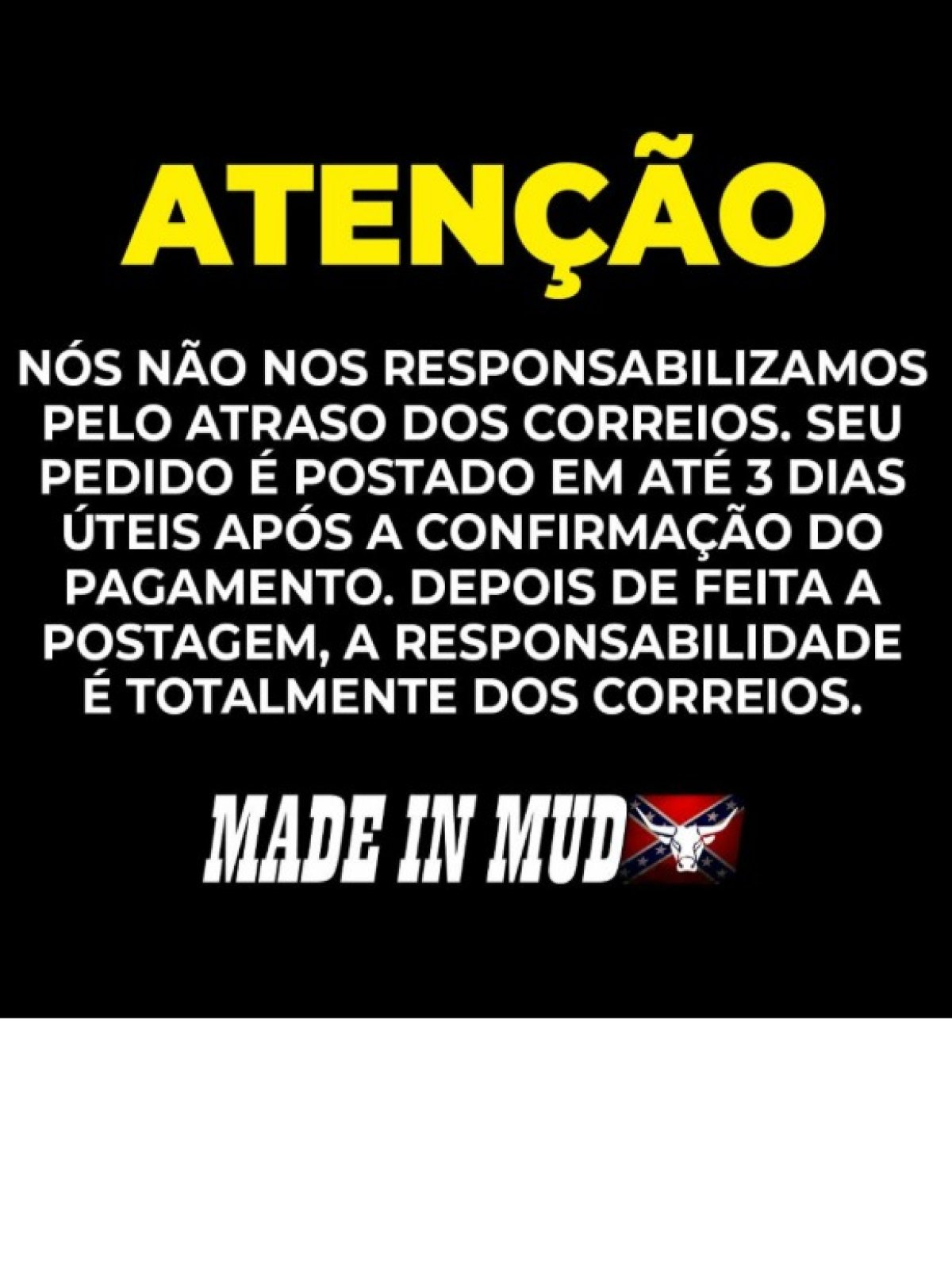 ATENÇÃO NÃO NOS RESPONSABILIZAMOS PELO ATRASO DOS CORREIOS. SEU PEDIDO É POSTADO EM ATÉ 3 DIAS ÚTEIS APÓS A CONFIRMAÇÃO DO PAGAMENTO. DEPOIS DE FEITA A POSTAGEM A RESPONSABILIDADE É TOTALMENTE DOS CORREIOS.